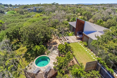 Nestled in the Blairgowrie Sand dunes, this bespoke mosaic tile pool was designed as a true back beach escape — a place of calm, luxury and coastal charm. Framed by native tea tree and natural textures, the space feels secluded and relaxed, offering a hidden hideout from everyday life. Hand-built in concrete and finished with custom mosaic tiles, the pool blends craftsmanship with understated elegance. A glass peek-a-boo window catches the light and enhances the sense of luxury.