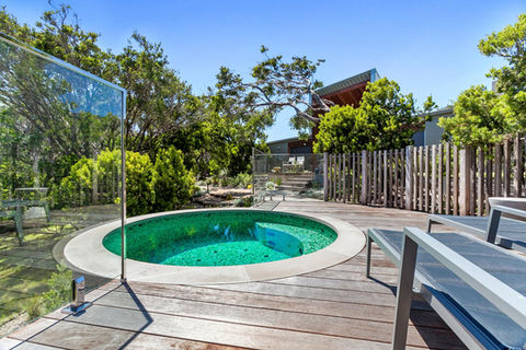 Nestled quietly among the trees in Blairgowrie, this round dip pool was designed as a secluded oasis — intimate, calm, and completely removed from its surroundings. Finished in rich green mosaic tiles, the pool reflects the foliage around it, blending seamlessly into the landscape and creating a sense of escape. A wrap-around timber deck softens the space, inviting slow moments of rest and easy movement between water and nature. The result is a peaceful, garden-like retreat — a hidden sanctuary made for cooling off, unwinding, and reconnecting.
